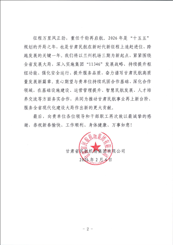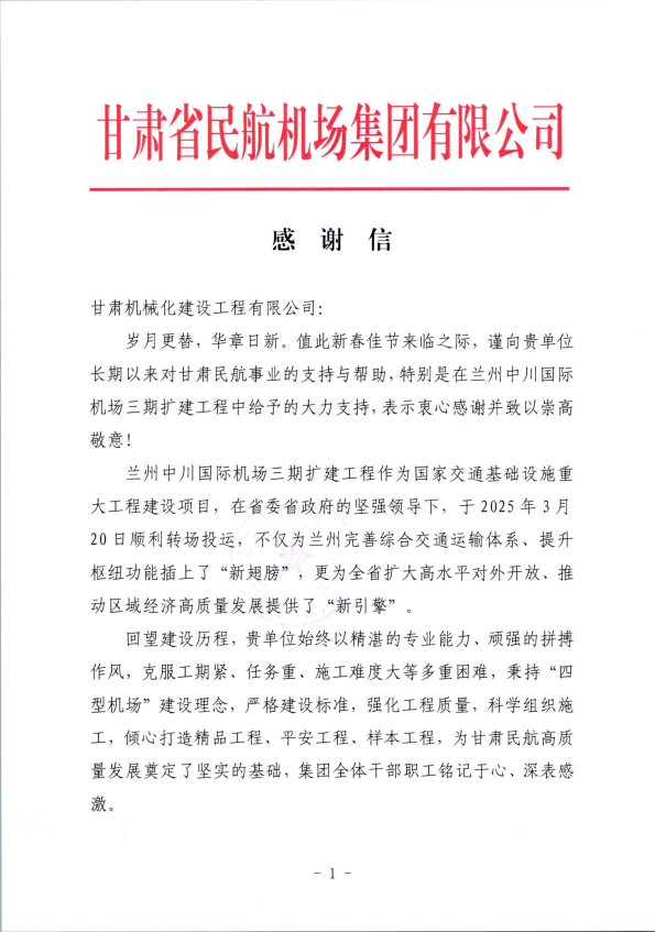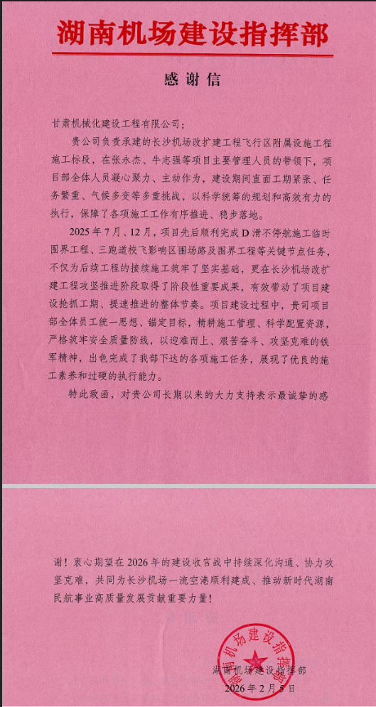 近日,我司接連收到甘肅省民航機場集團、湖南機場建設(shè)指揮部發(fā)來的感謝信,對我司在蘭州中川國際機場三期擴建工程、長沙機場改擴建工程中的突出表現(xiàn)給予高度評價與誠摯感謝。